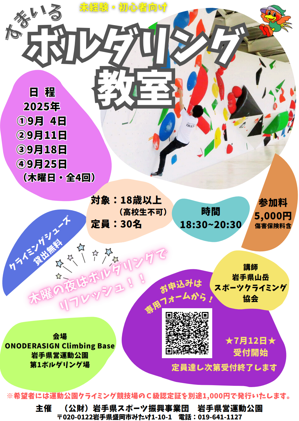 傷害保険料を含む参加料はかかりますが、クライミングシューズは無料で借りられます。講師を務めるのは岩手県山岳スポーツクライミング協会。「クライミングに一度挑戦してみたい!」「教えてもらいたい!」「なにかをはじめたい!」など、参加理由はなんでもOKだそうです!