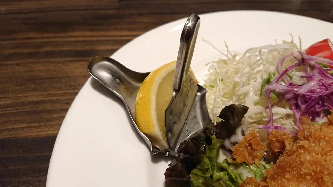 レモンを絞る道具にカットしたレモンが乗っていました! はじめて使用しましたが、手が汚れず好きな量を調整しながらレモンをかけられるので便利です。
