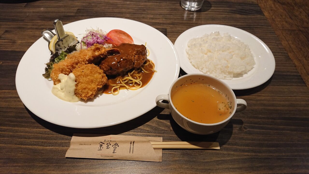 ハンバーグ、そしてホタテフライと海老フライの組み合わせは、お店のスタッフさんが目の前にお皿を置いてくれた瞬間から、食べるまえでもワクワクします! ライスとコンソメスープ付きです。
