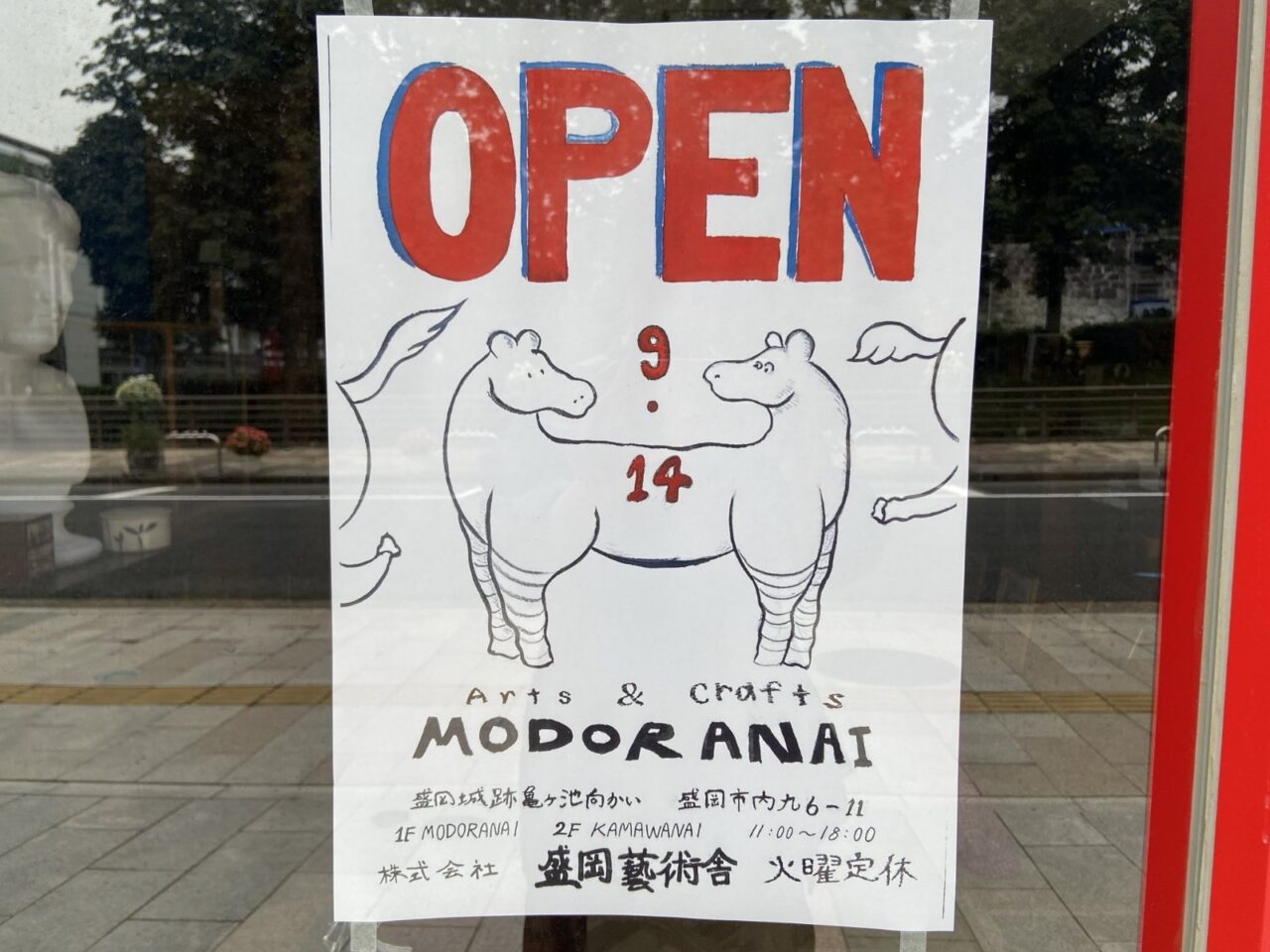 店名はArts&Crafts MODORANAI、ぱっと目を引く素敵な赤色の入口です。2025年9月14日(日)にオープンを予定しています。店舗2Fは、Gallery&Cafe KAMAWANAIで、9月14日(日)から11月16日(日)まで第一回展示があるそうですよ!Arts&Crafts MODORANAI暑さが和らいですごしやすい気温になった盛岡では、毎週のように各地でイベントが開催されています。Arts&Crafts MODORANAIの付近にある盛岡城跡公園でも、これからたくさんのイベントが予定されていますね! 秋のおでかけの際にチェックしてみてはいかがでしょうか?