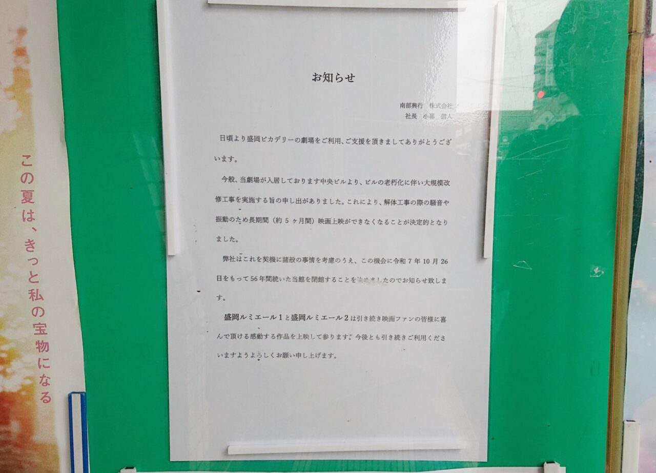盛岡ピカデリーが2025年10月26日(日)をもって閉館すると発表がありました。映画のまち盛岡を支えた劇場の閉館に驚いたり、さみしさを感じたりした方も多いのではないでしょうか?
