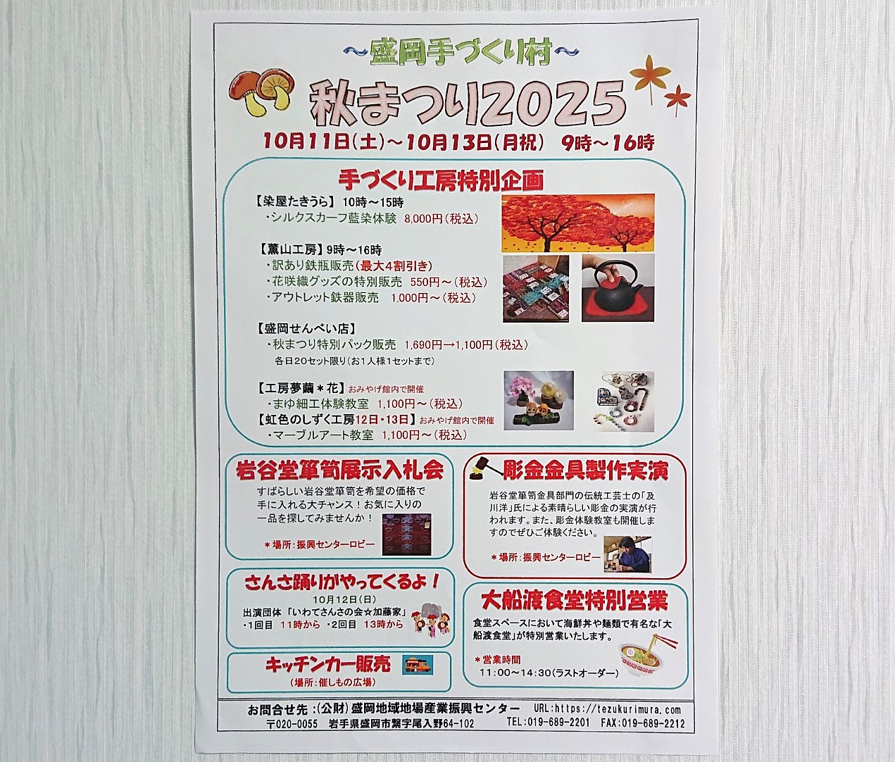 繋にある盛岡手づくり村で秋まつり2025が開催されます! 期間は、2025年10月11日(土)から10月13日(月祝)の3日間です。製作体験やアウトレット価格での鉄瓶販売、盛岡せんべい店では特別パックの販売、キッチンカー販売などの企画が数多くあります。手づくり村秋まつり2025のチラシ秋まつり開催期間中には大船渡食堂の特別営業もあるそうです! 限定20食で秋刀魚つみれそばやカキフライそばが食べられます。手づくり村秋まつり2025大船渡食堂またいわてさんさの会☆加藤家によるさんさ踊りも見られます! ユニークで見ていると自然と笑顔になる、楽しい雰囲気の加藤家のさんさがやってくるのは期間中10月12日のみです。