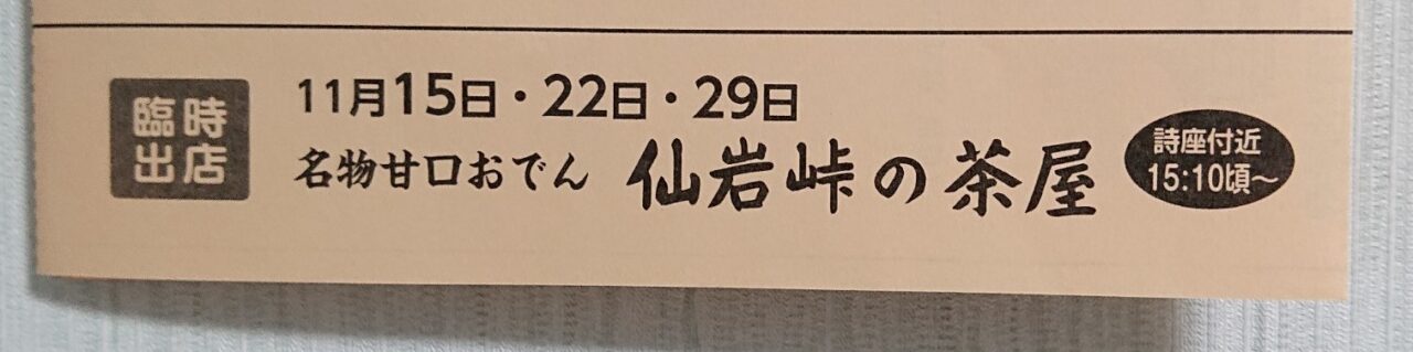 11月は臨時で名物甘口おでん 仙岩峠の茶屋が出店します。寒い季節に屋外で食べるおでん、この時期ならではの楽しみだったりするかたも多いのではないでしょうか。