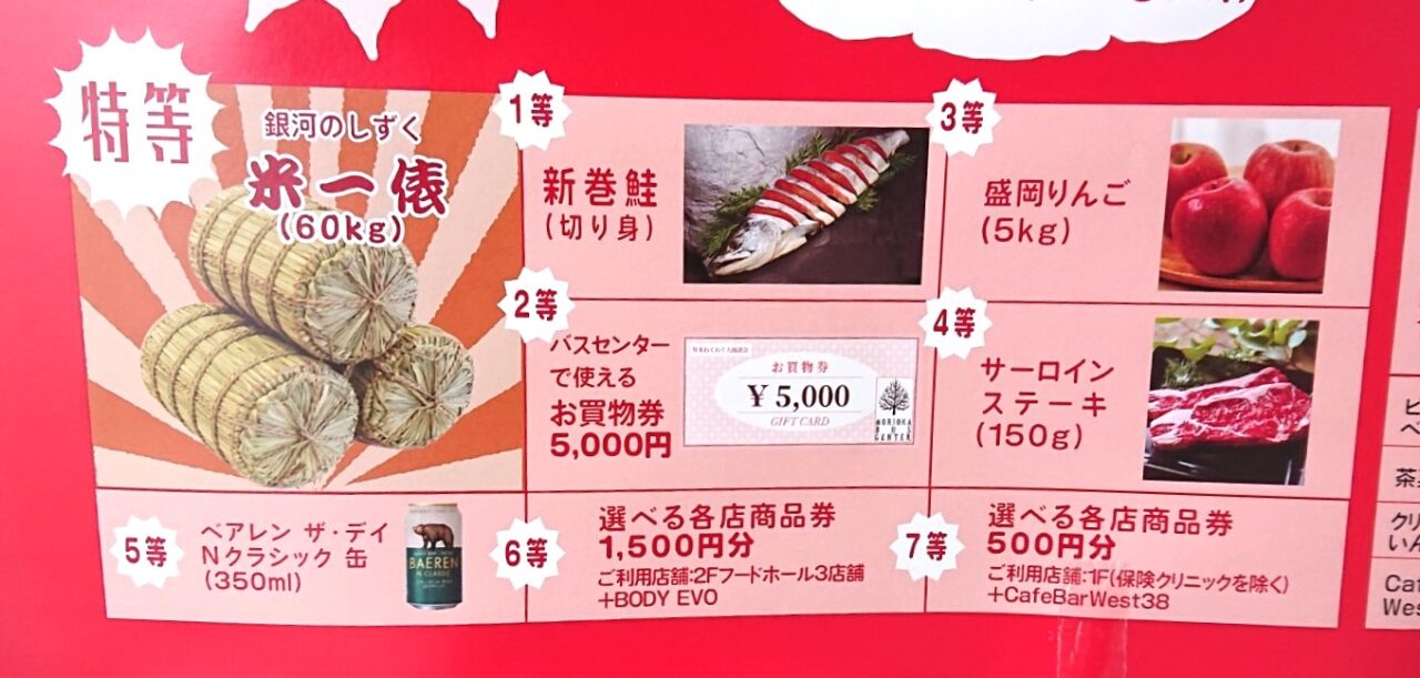 特賞はなんと銀河のしずく 米一俵(60㎏)です! 当たった時のことを考えてみるだけでワクワクしてきますね。ほかにも1等 新巻鮭の切り身、2等 バスセンターで使用できるお買い物券5,000円、3等 盛岡りんご5㎏、4等 サーロインステーキ(150g)などをはじめとした豪華賞品が当たるかもしれません! 空クジはないとのことで参加賞もあります。